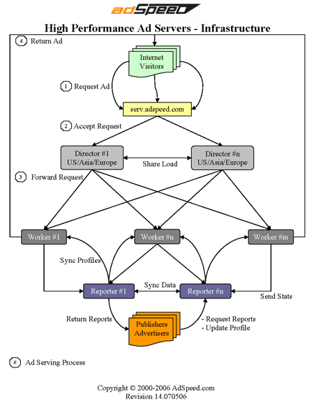 There are three types of server in the system: director, worker and reporter. As a visitor loads a webpage with the ad serving code, this code makes a request to a nearest load balancing server, a director. We use multiple clusters of servers in U.S., Europe and Asia for the fastest ad delivery to your visitors.Directors