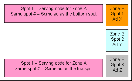 When getting serving code for any zone, you can specify the spot number for that serving code. You can set the spot number so that they serve different ads or the same creative.- Different spot number for a different ad: If spot #1 already shows ad X then spot #2 will not show ad X again. It will show ad Y.